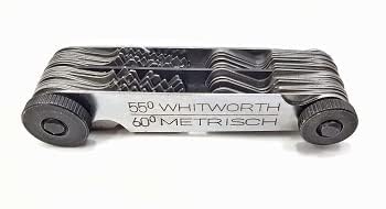 A thread gauge, also known as a screw gauge or pitch gauge, is used to measure the pitch or lead of a screw thread. Thread pitch gauges are used as a reference tool in determining the pitch of a thread that is on a screw or in a tapped hole To use a thread gauge, the user must first match the type of thread to the gauge. For example, attempting to measure metric threads with an imperial gauge will not return accurate results. To determine the correct gauge, a process of trial and error may be needed if the screw is of unknown origin. Once the correct gauge is determined, the user should extend one of the leaves of the tool and press it against the threaded portion of a screw. If the teeth (cut into the leaf) match the spacing of the thread, then the user can read off the thread pitch stamped into the leaf. If the fit is not good, the user should try a different leaf. Note that this tool is not for accurate measurement of an unknown thread, such as a hand-turned thread from a lathe. This tool is meant for a best-approximation measurement to a known thread standard. & Used to check thread angle and pitch of thread cutting tools. / Use to grind and position thread cutting tool on a lathe 55 degree angle, tempered with a satin-chrome finish Extremely handy for use in grinding and setting screw cutting tools / Hardened with lapped edges and notches Very useful for finding number of threads per inch through graduations in 1/14″ and 1/20″ of an inch on center gauge Ground gauging surfaces